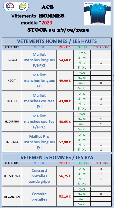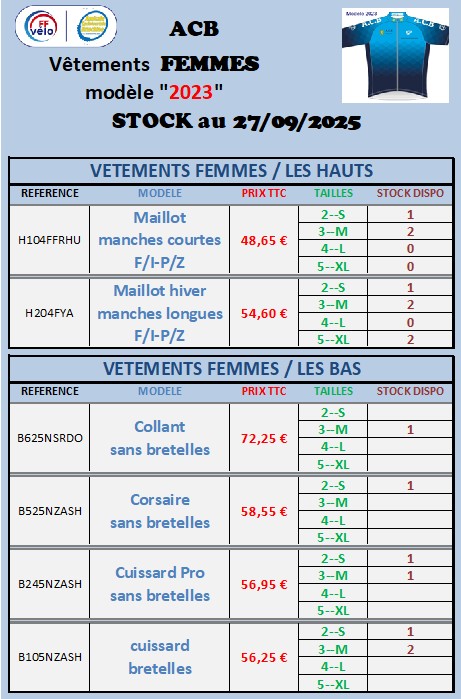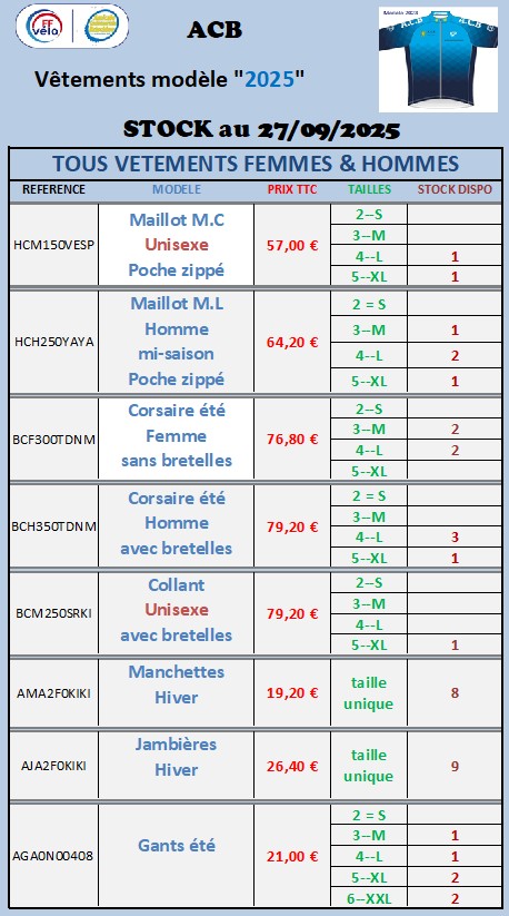 Vous trouverez ci dessous en 3 tableaux les maillots, cuissards, manchettes, jambières, gants, disponibles sans commande.